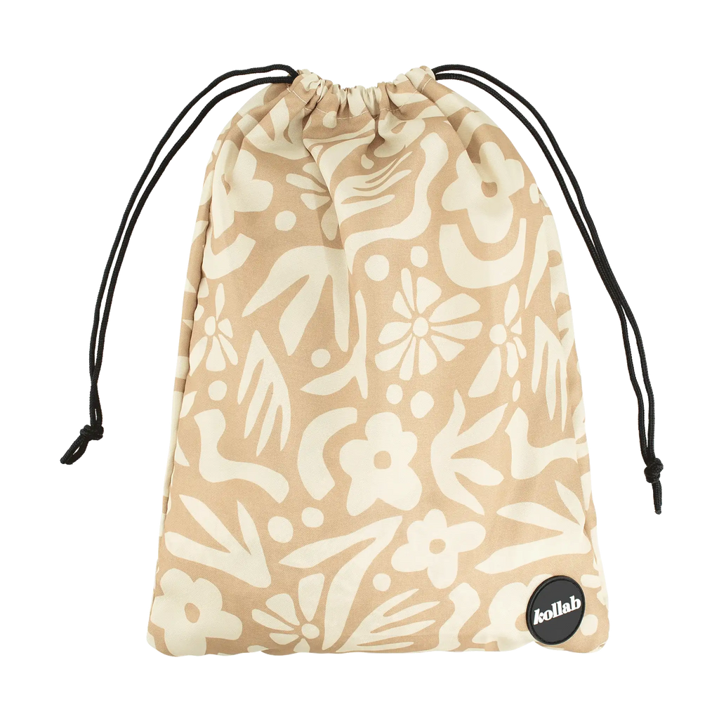 The print features an abstract floral and botanical pattern. The background is a soft, olive-toned beige, and the pattern is a pale citron yellow.