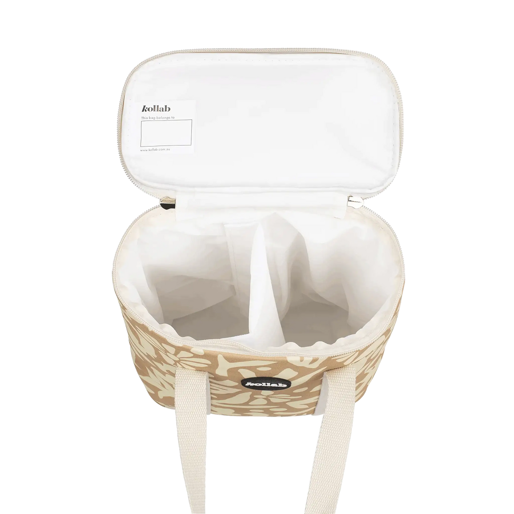 The print features an abstract floral and botanical pattern. The background is a soft, olive-toned beige, and the pattern is a pale citron yellow.